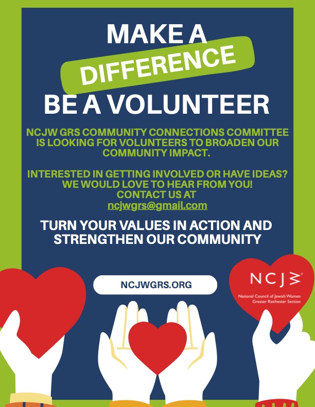 As a member of NCJW Greater Rochester Section you will be connected to a growing network of courageous and compassionate individuals who work together to improve the quality of life for women, children and families every day. We join with 180,000 other advocates nationally to make our voices heard in New York, Washington DC and Israel as we fight for social justice. As an organization, we take action and work together to be a positive force for change.